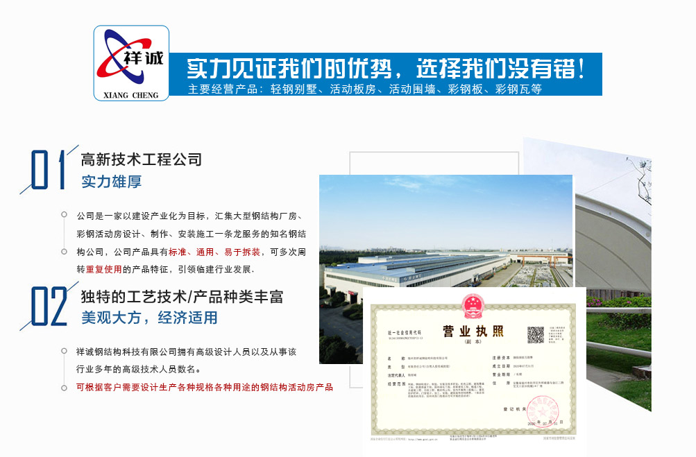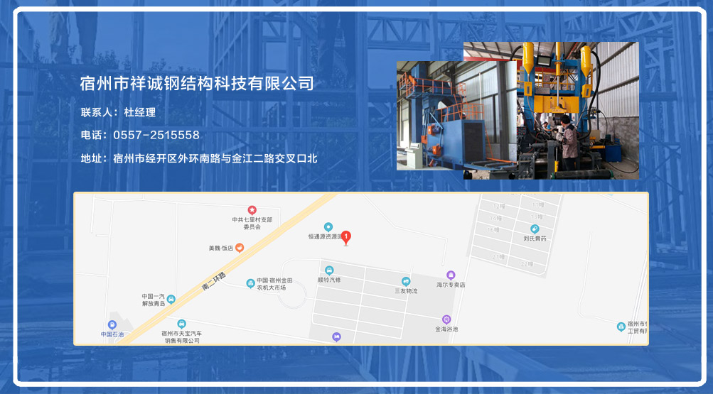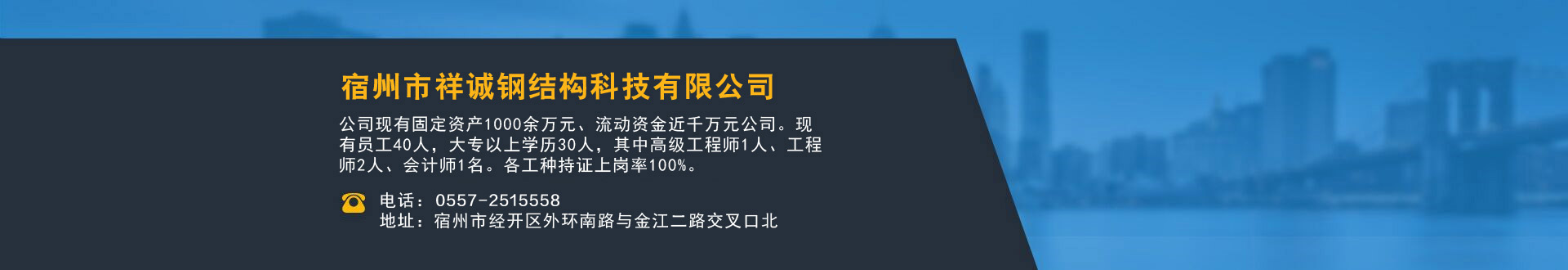 宿州市祥誠鋼結(jié)構(gòu)科技有限公司位于宿州市經(jīng)開區(qū)外環(huán)南路與金江二路交叉口北,公司是一家以建設(shè)產(chǎn)業(yè)化為目標(biāo),匯集大型鋼結(jié)構(gòu)廠房、彩鋼活動房設(shè)計、制作、安裝施工一條龍服務(wù)的知名鋼結(jié)構(gòu)公司。公司現(xiàn)有固定資產(chǎn)1000余萬元、流動資金近千萬元公司?,F(xiàn)有員工40人,大專以上學(xué)歷30人,其中高級工程師1人、工程師2人、會計師1名。各工種持證上崗率100%。高效化的年青團(tuán)隊為公司帶來了蓬勃發(fā)展的動力,全體員工以務(wù)實的態(tài)度,拼搏的精神,創(chuàng)造著企業(yè)的每一天。 公司組織結(jié)構(gòu)嚴(yán)格按現(xiàn)代企業(yè)制度設(shè)計,管理機(jī)構(gòu)設(shè)置合理,制度完善,各部門分工明確...